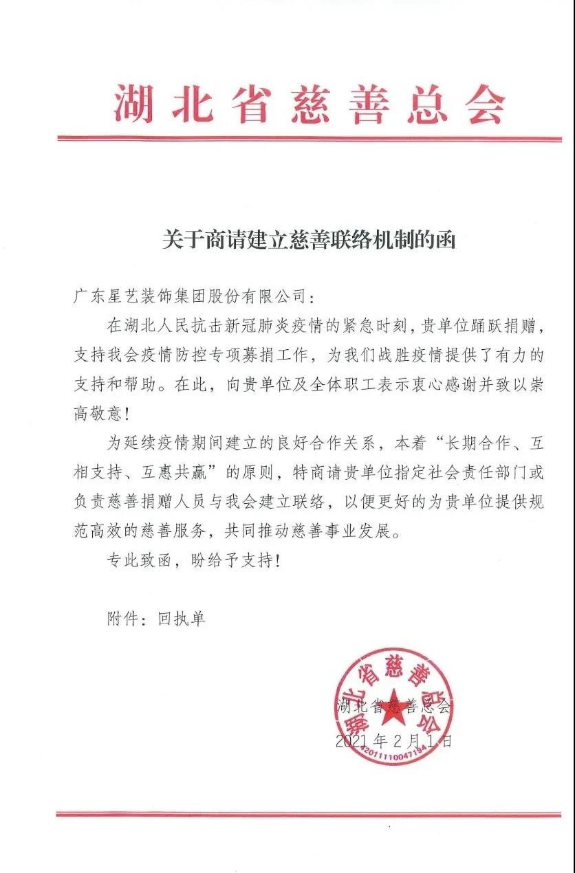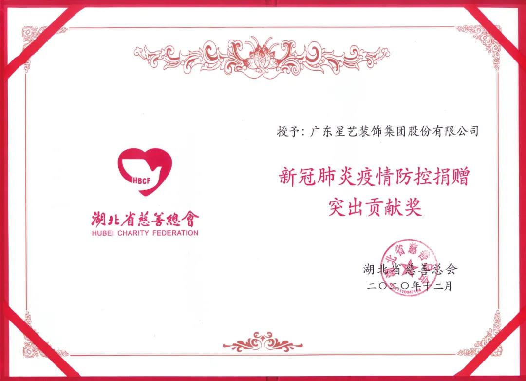 湖北省慈善總會(huì)授予廣東星藝裝飾集團(tuán)“新冠肺炎疫情防控捐贈(zèng)突出貢獻(xiàn)獎(jiǎng)”。